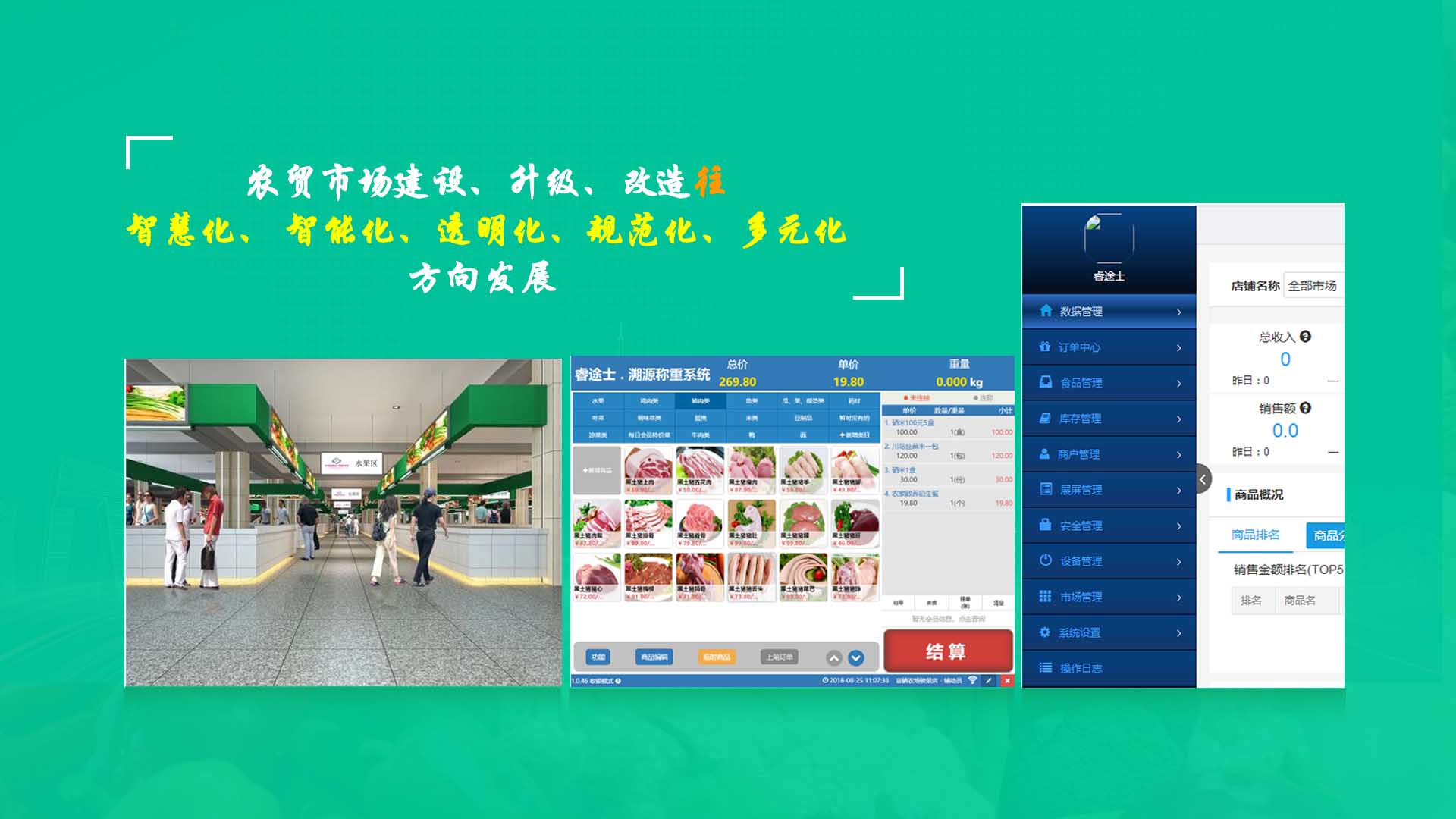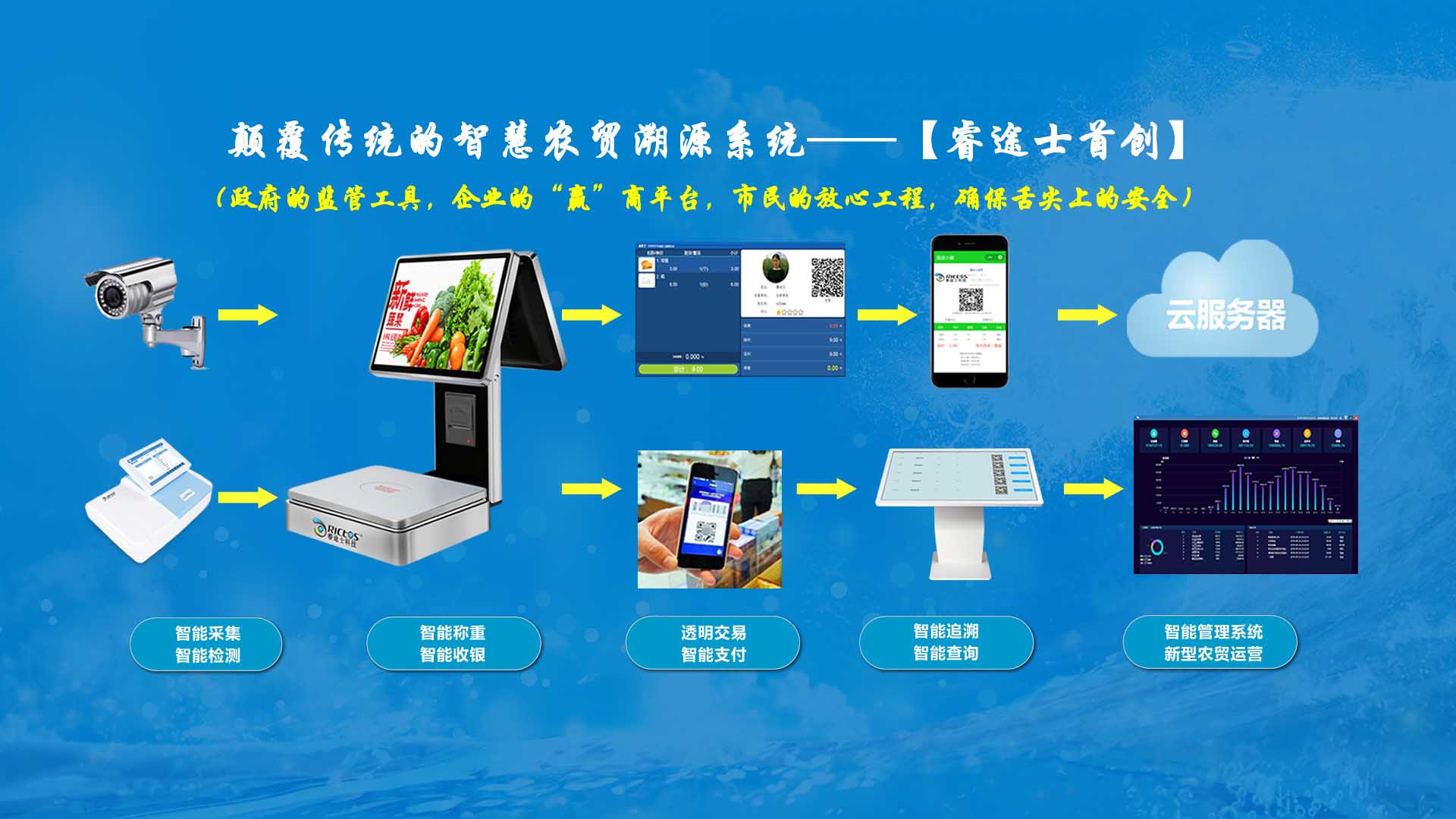 創(chuàng)新實(shí)現(xiàn)了【智慧農(nóng)貿(mào)溯源管理系統(tǒng)】與【智能稱重收銀】一體化解決方案,集市場(chǎng)管理、運(yùn)營(yíng)管理、溯源追溯、智能收銀大數(shù)據(jù)運(yùn)用于一體,硬件、軟件與管理系統(tǒng)完美結(jié)合。適用于農(nóng)批、農(nóng)貿(mào)市場(chǎng)蔬菜、生鮮、水果、水產(chǎn)、肉類、熟食等稱重和非稱重銷售;由于采用一體化設(shè)計(jì),解決了傳統(tǒng)農(nóng)貿(mào)市場(chǎng)無法實(shí)現(xiàn)的信息化、智能化、可追溯的管理問題;使稱重、收銀、追溯、管理、更透明、公正、安全,讓顧客無后顧之憂,給管理工作帶來極大的便捷與高效,對(duì)國(guó)內(nèi)農(nóng)產(chǎn)品行業(yè)的發(fā)展、農(nóng)產(chǎn)品流通管理起到了典范作用。 【睿途士首創(chuàng)】顛覆傳統(tǒng)的“智慧農(nóng)貿(mào)市場(chǎng)系統(tǒng)”,解決了傳統(tǒng)農(nóng)貿(mào)系統(tǒng)單一安卓掛屏,昂視不方便看、不直觀、無互動(dòng)性,傳輸信息不齊全、不穩(wěn)定的問題,也解決了按鍵電子秤商品難找、商品代碼難記、按鍵操作不靈活、支付不智能,對(duì)收銀管理、銷售商品、菜名、菜價(jià)、打折、優(yōu)惠、會(huì)員、線上下單、采購(gòu)等無法實(shí)現(xiàn)實(shí)際菜品交易和追溯等問題。 更具顛覆性的是睿途士智慧系統(tǒng)擁有三大管理平臺(tái)(市場(chǎng)管理平臺(tái)、總部運(yùn)營(yíng)管理平臺(tái)、商戶后臺(tái)管理平臺(tái))、一個(gè)可視操作前臺(tái)和三大追溯功能,讓遠(yuǎn)程管理、數(shù)據(jù)傳輸、人機(jī)互動(dòng)、智能控制、移動(dòng)支付、大數(shù)據(jù)、互聯(lián)通信、云端存儲(chǔ)、人工智能、智能城市、電子定位、智能收銀等功能得以實(shí)現(xiàn)。