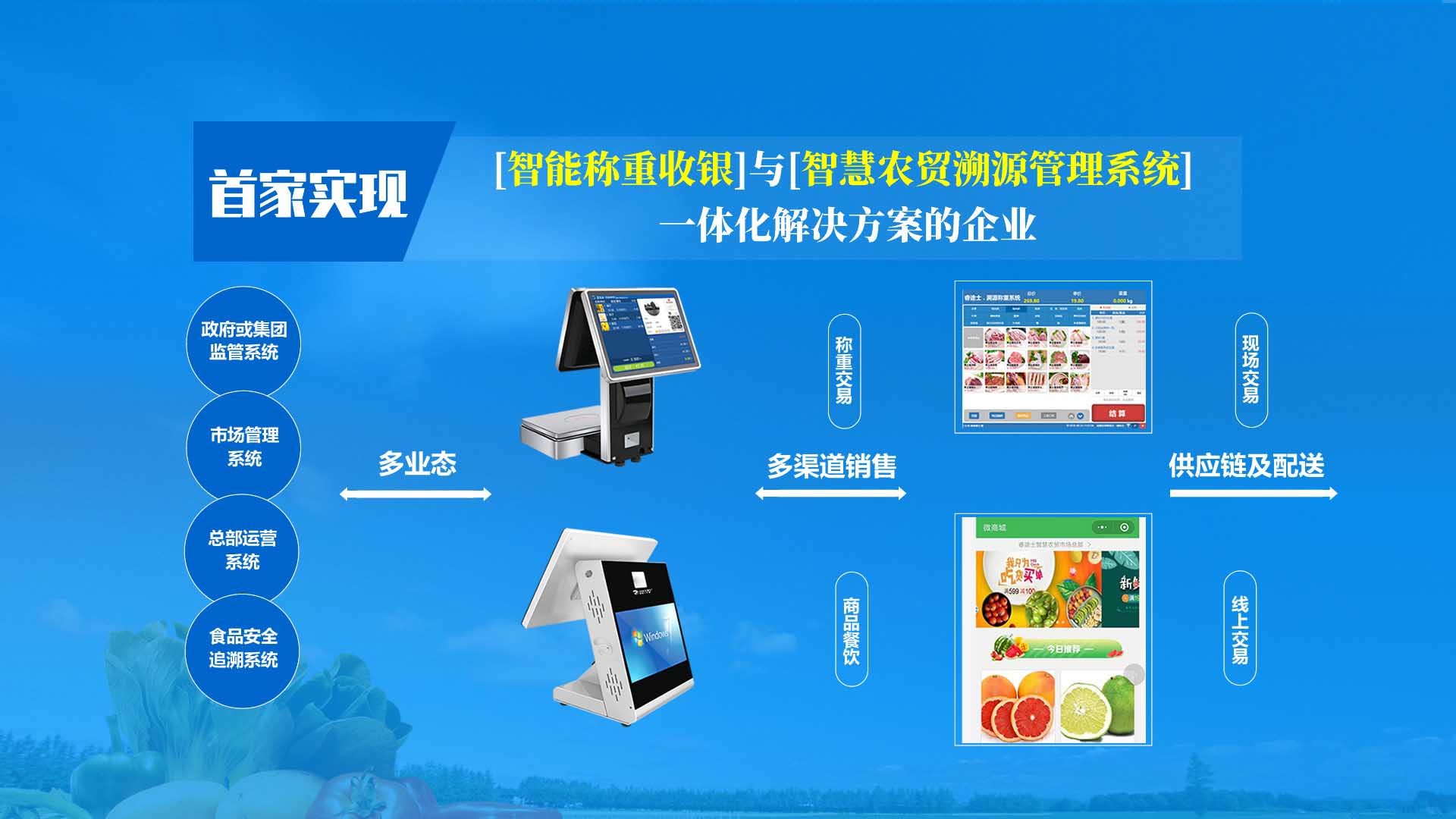 統(tǒng)一管理系統(tǒng)、規(guī)范溯源秤重、杜絕缺斤少兩、提升市場(chǎng)信譽(yù)度,革新市場(chǎng)營(yíng)銷和集群推廣模式。